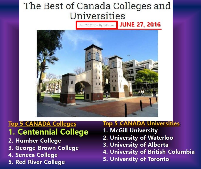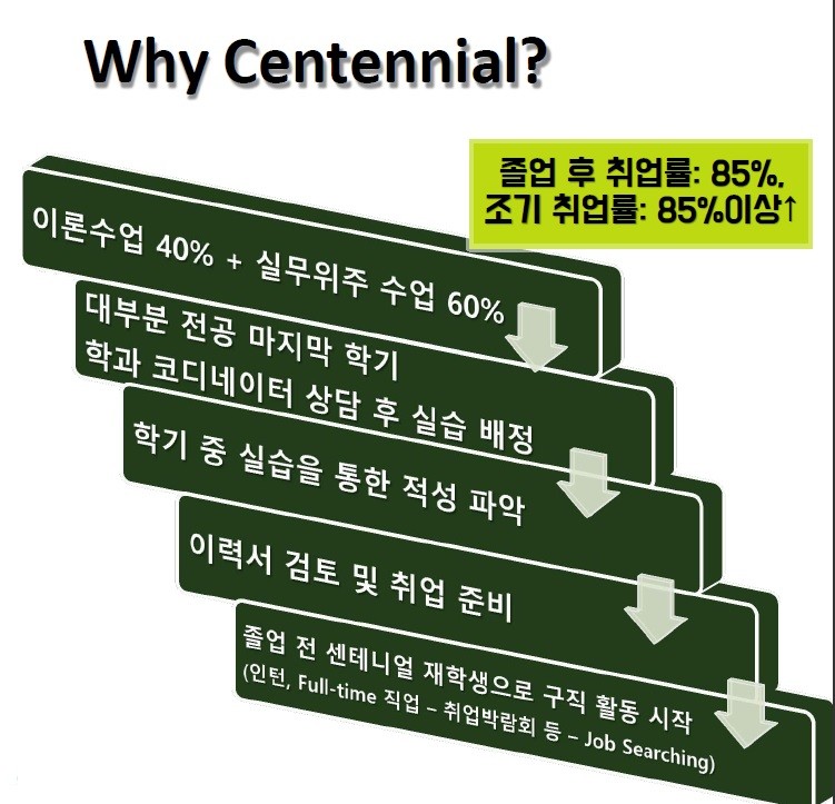 2016년에는 캐나다 컬리지 순위에서 1등을 하기도 한 센테니얼컬리지는, 명실공히 캐나다 최고의 컬리지로 자리잡았습니다. 또한 졸업 후 85% 이상의 높은 취업률을 보이고 있으며, 특히 한국학생 졸업생들은 87%의 취업률을 보였다고 합니다(2016년 기준). 또한 토론토 대도시권(GTA) 학교 중 고용주/졸업생 1위 최고 만족도를 보이고 있습니다. 이런 사실들은 안정된 양질의 직업을 통해 이민 지원이 용이하다는 것을 반증하기 때문에, 캐나다에서의 유학 후 취업을 통해 이민을 목표로 하는 분들에게 매우 고무적인 사실입니다.